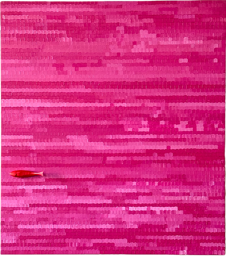 Pinc Code entstand aus dem Wunsch, Ordnung und Individualität gegenüberzustellen. Das gleichmäßige Raster steht für System und Erwartungen die unsere Leben prägen. Der rote Fisch — ein wiederkehrendes Motiv meiner Arbeiten — schwimmt quer dazu: leise aber bestimmt. Er symbolisiert den Impuls den eigenen Weg zu suchen statt mitzuschwingen.
